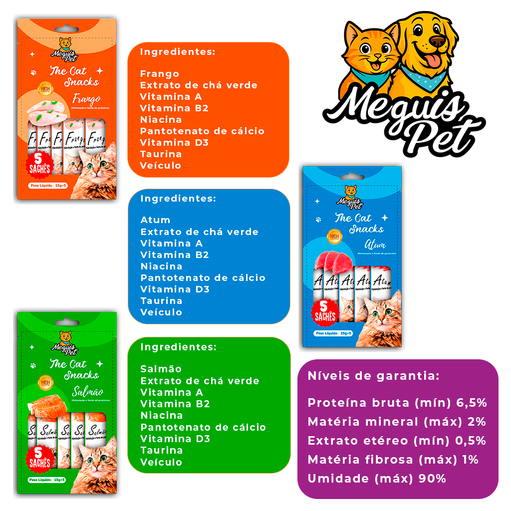 Kit15 Petisco Snack Cremoso MeguisPet p/Gatos Sabor 1Frango +1Atum +1Salmao= 3 Pacotes Total 225g